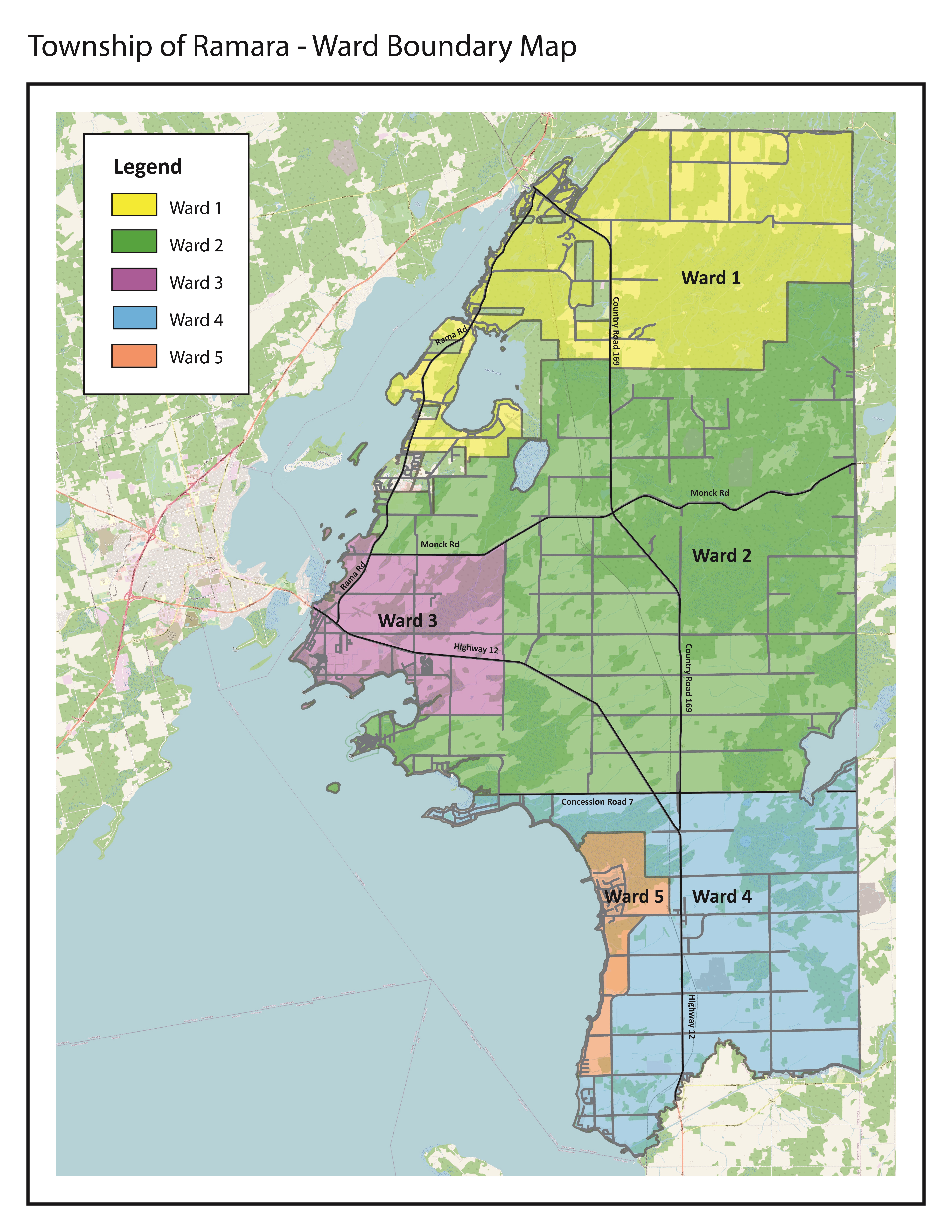 Ward 1 begins at the northern-most point of the Township of Ramara, south of the Black River at Highway 6. The boundary travels the following route:
