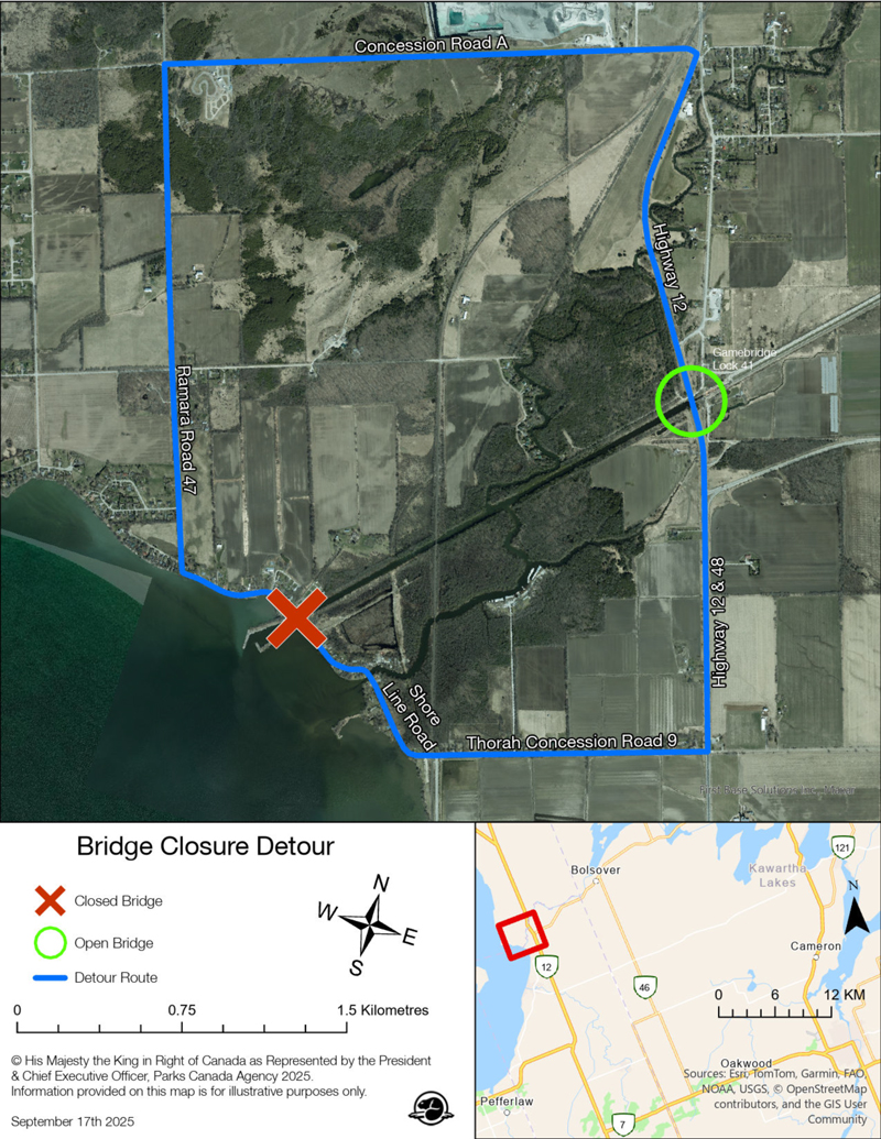 Parks Canada has advised that the Lakeshore Road Swing Bridge #50 on Ramara Road 47 near Gamebridge will be closed to road traffic for re-decking from 8 a.m. on Monday, Oct. 6, 2025, to 5 p.m. on Friday, Oct. 10, 2025.