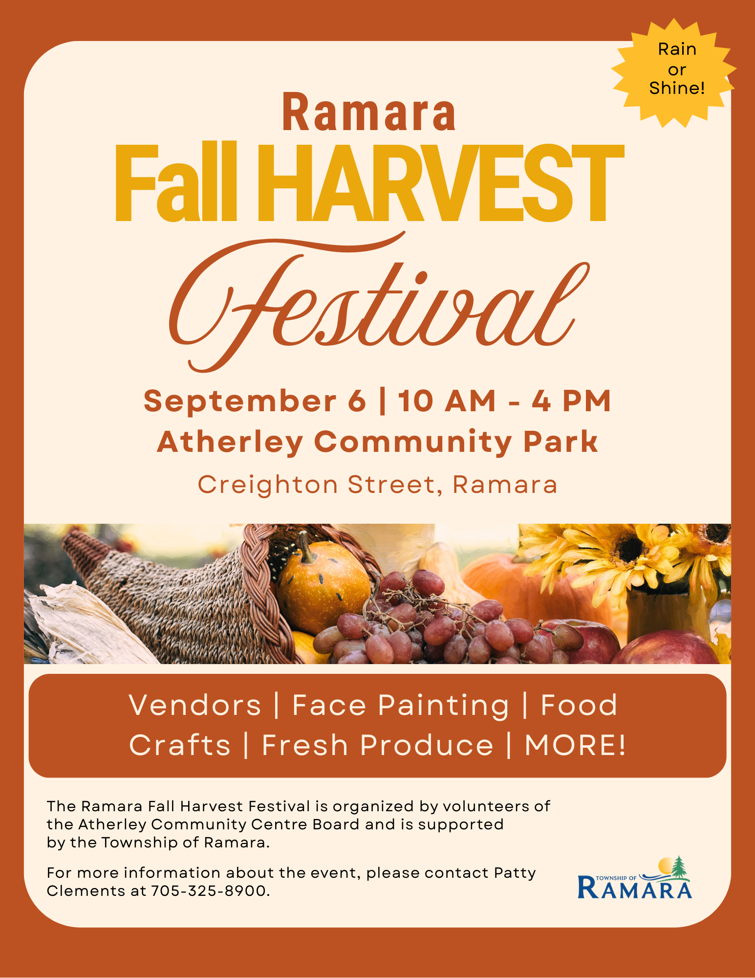 Ramara, Ont. / Aug. 27, 2025 – The Township of Ramara’s Atherley Community Centre Board invites residents to join in welcoming the fall season at the Ramara Fall Harvest Festival, taking place Saturday, Sept. 6 from 10 a.m. to 4 p.m. at the Atherley Community Park on Creighton Street.